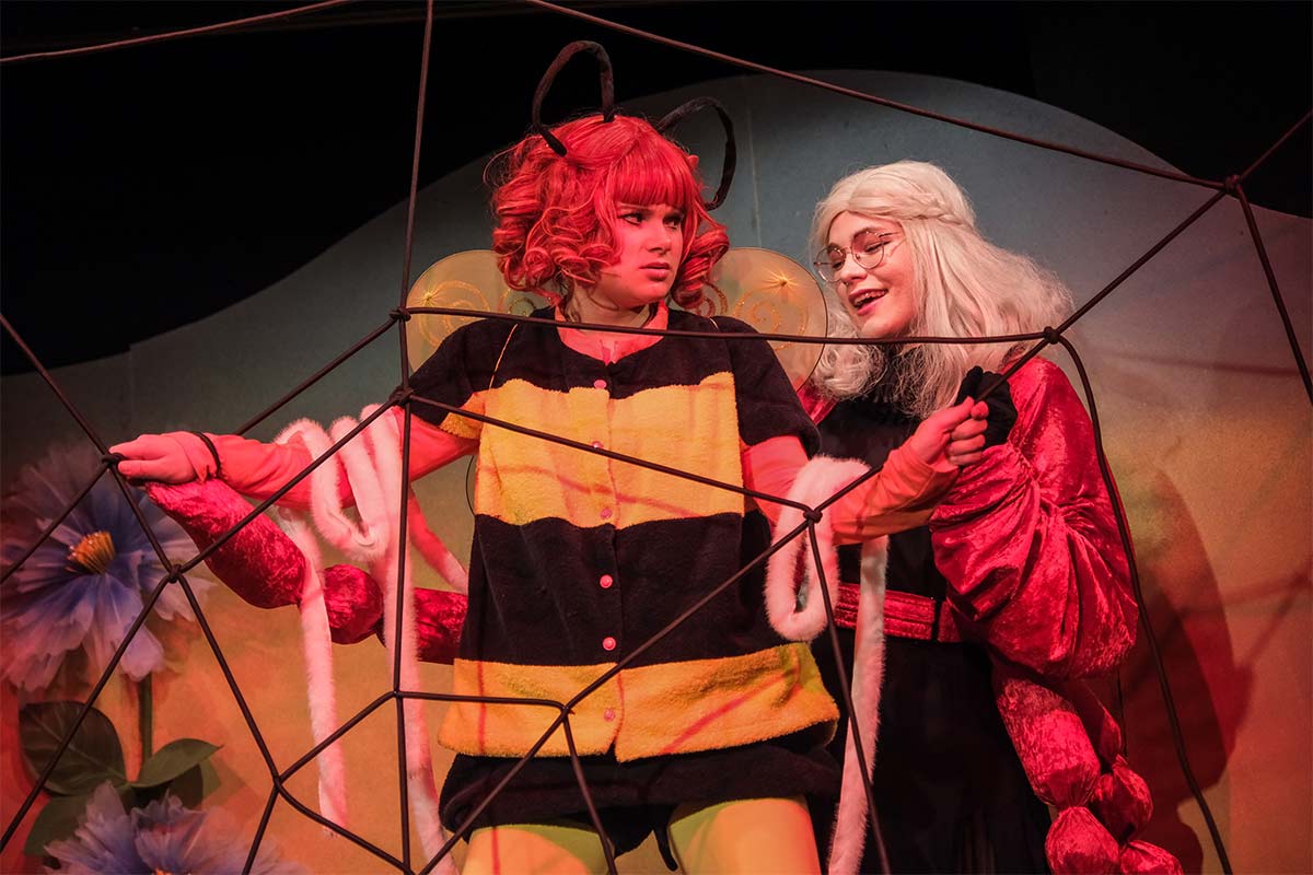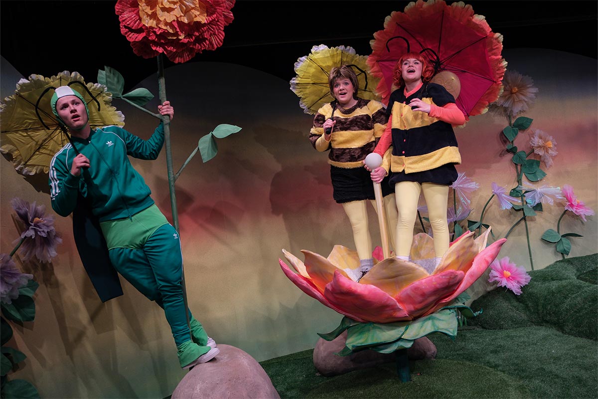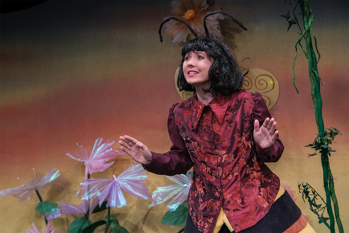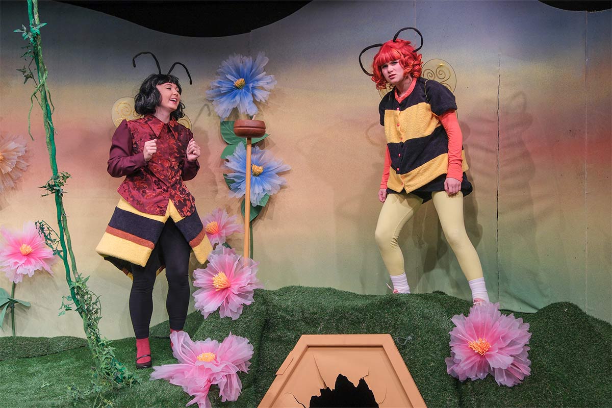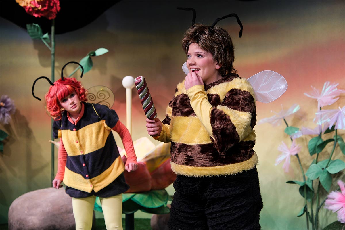 Wer kennt sie nicht: die fröhliche und sehr mutige kleine Biene Maja, die nach langer Zeit nun endlich wieder über Flensburg in ein „unbekanntes Land“ fliegt, wo ein spannendes Abenteuer auf sie wartet. Denn das Gelee Royal, das für das Überleben aller Bienen lebensnotwendig ist, wurde von den bösen Hornissen gestohlen. Doch die frisch geschlüpfte Maja, neugierig und übermütig die große, weite Welt entdeckend, kennt keine Furcht und beschießt, das Gelee Royal zurückzuholen; eifrig unterstützt von ihrem neugewonnenen Freund Hubsi, die Hummel. Auf ihrer musikalischen Abenteuerreise begegnen beide Puck die Stubenfliege, die Libellen Schnick und Schnuck, Kurt der Mistkäfer, eine gut organisierte Ameisengruppe angeführt von Paula Emsig, Thekla die hungrige Spinne, sanftmütige Schnecken und natürlich die bösen Hornissen…